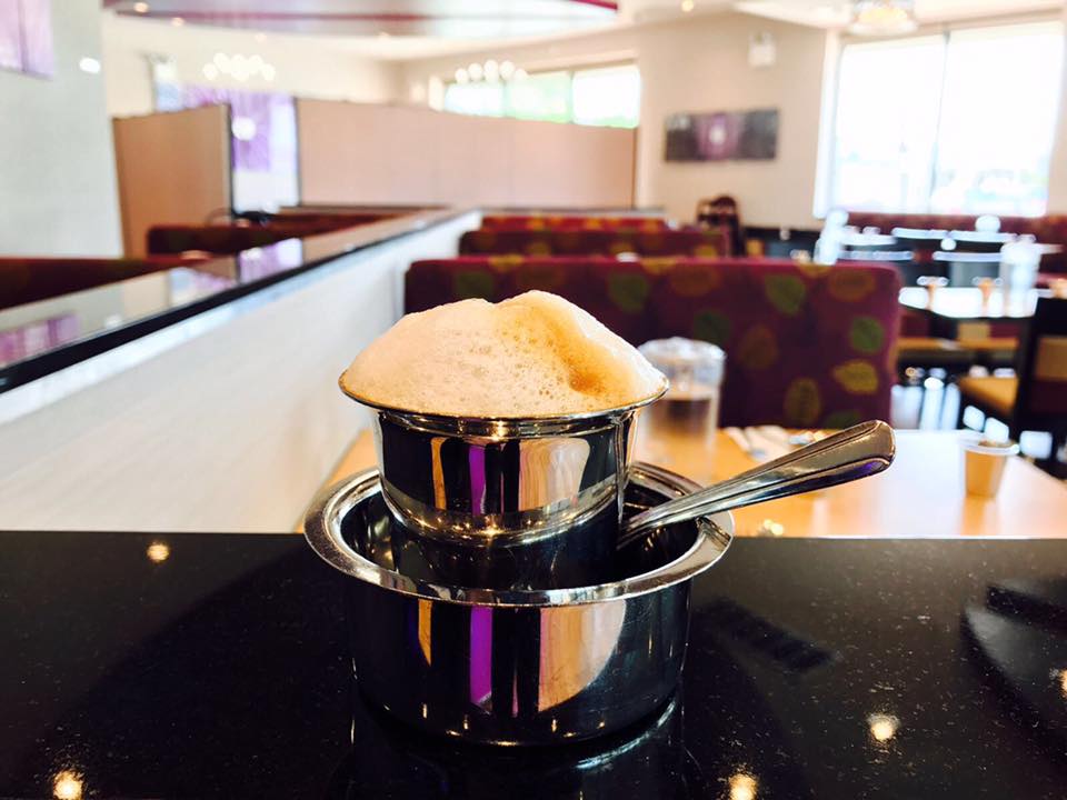 Madras Filter Coffee is a beloved South Indian brew made from dark-roasted coffee grounds (often mixed with chicory for body and bold flavor) percolated through a special metal filter, yielding a strong, aromatic decoction that's then mixed with hot milk and sugar, and frothed by pouring between a tumbler and dabara (small bowl) for a rich, traditional, and frothy coffee experience.